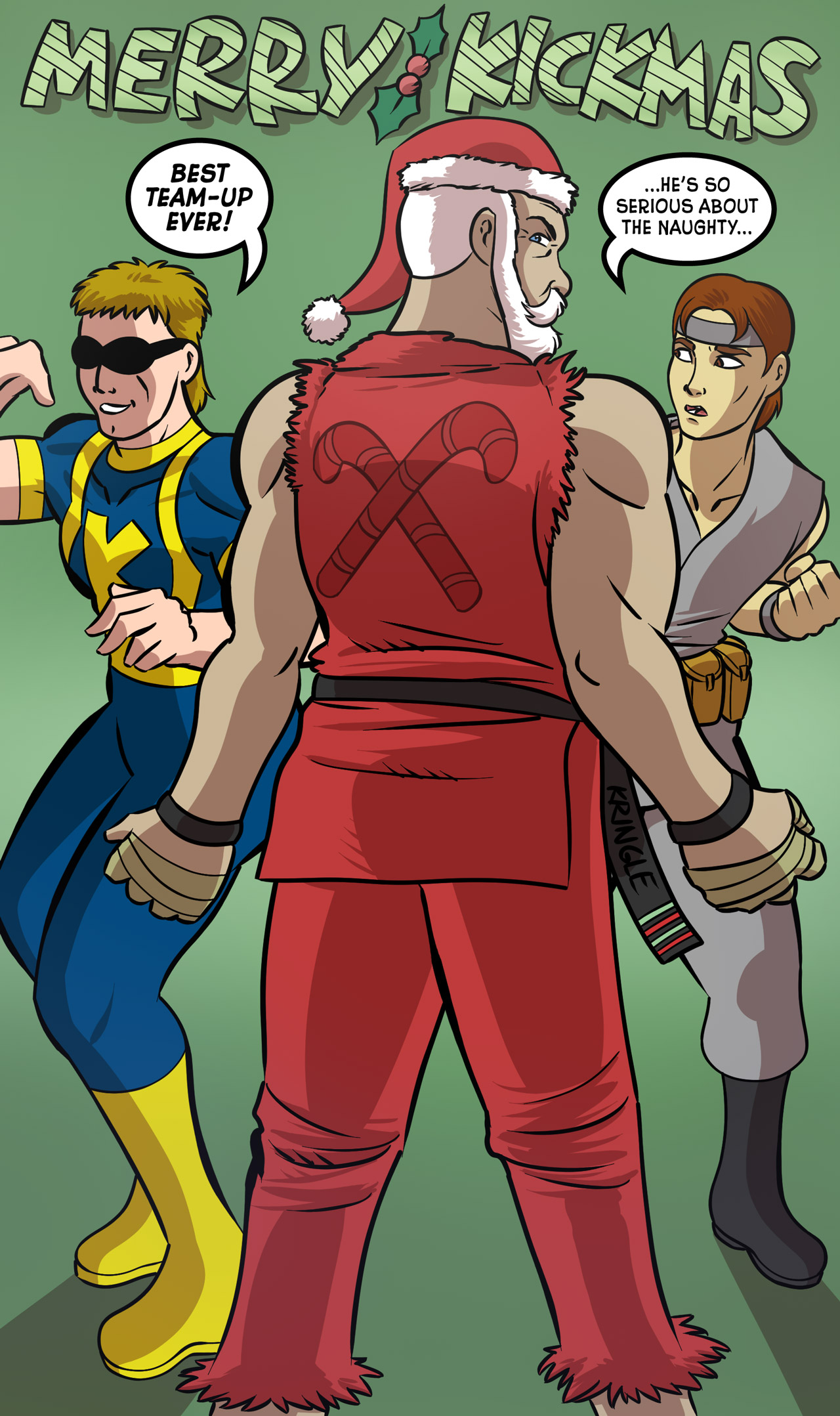 Every year the Collective of Heroes hosts a Secret Santa art exchange. This is the piece that I received from Lightfoot, creator of the Webcomic Pulse. Featuring a might comics team-up crossover event. Kickman and Generc Kung-Fu Superhero Sidekick meet Santa.