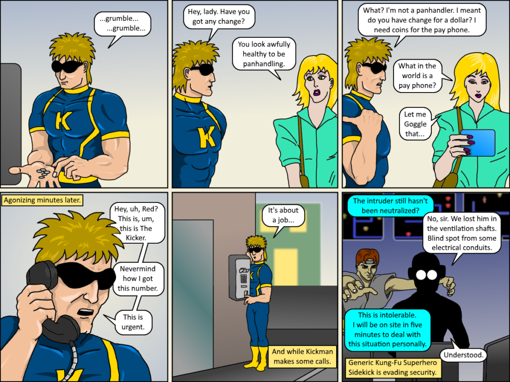 For those wondering what the heck is going on with this whole story arc, this last panel should at least shed some light on what the heck Generic Kung-Fu Superhero Sidekick has been doing all this time. Obviously he is[…]↓ Read the rest of this entry…