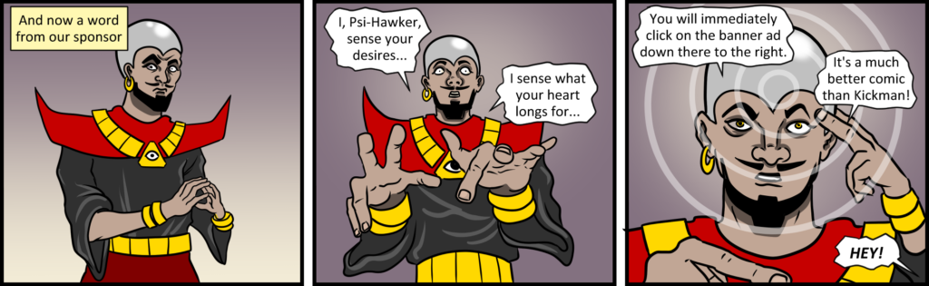 So this is what happens when I don’t take enough time out of my day to write a proper comic strip. Although I would like to post a shout out to whichever comic is in that skyscraper size ad on[…]↓ Read the rest of this entry…