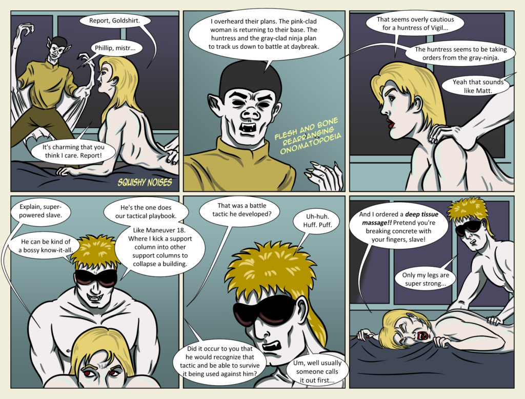 The panels on this page are probably interpreted waaaay differently without the dialog bubbles… Um. I finished this almost a week ago but it failed to publish at it’s scheduled time. Sorry folks. And on the clothing optional episode, too![…]↓ Read the rest of this entry…