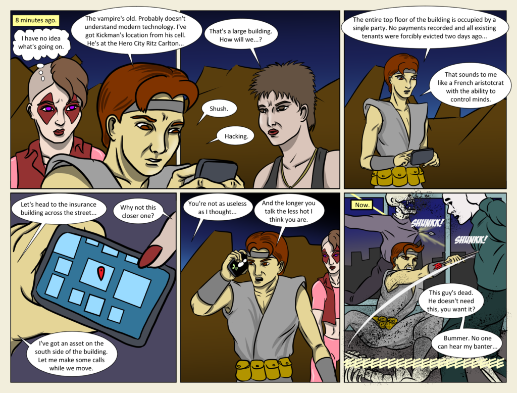 Sorry, another day late. And right in the middle of a flashback/action sequence. Has anyone had enough of me using the non-linear chronology storytelling trope? Gotta go. Uploading this comic at my day job office…