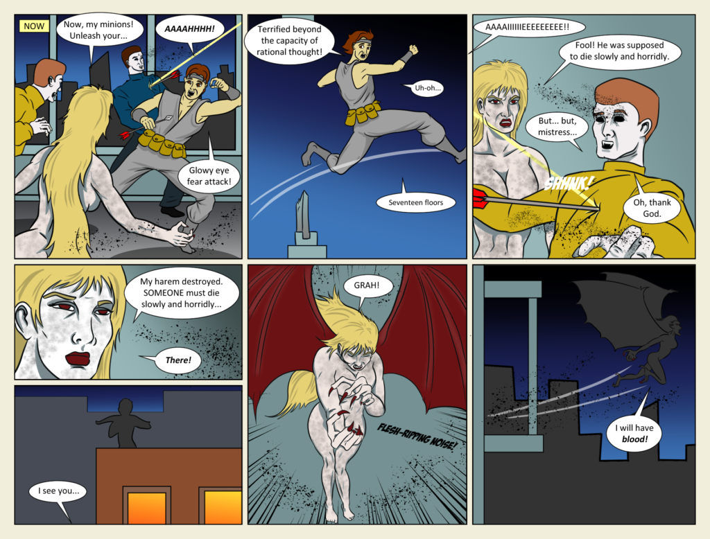 Kickman vampyrized and paralyzed with Dead Man’s Blood… Generic Kung-Fu Superhero Sidekick takes a Wyle E. Coyote plunge off the penthouse… Will the Huntress of Vigil save the day? Find out next week… in the adventures of Kickman!