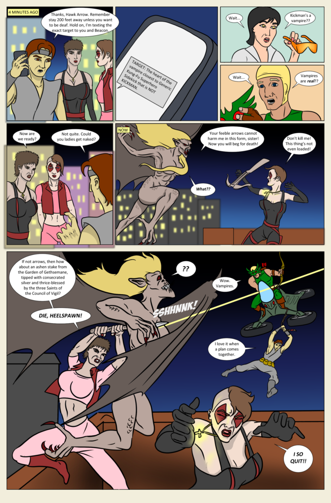 Double-sized issue today. Ok, it’s a page with an extra frame, but it’s a really big frame. One final misdirect from Sidekick Matt. Also one of those time-bending scenes where the heroine says a complete sentence in mid-attack. Also, “Heelspawn”[…]↓ Read the rest of this entry…