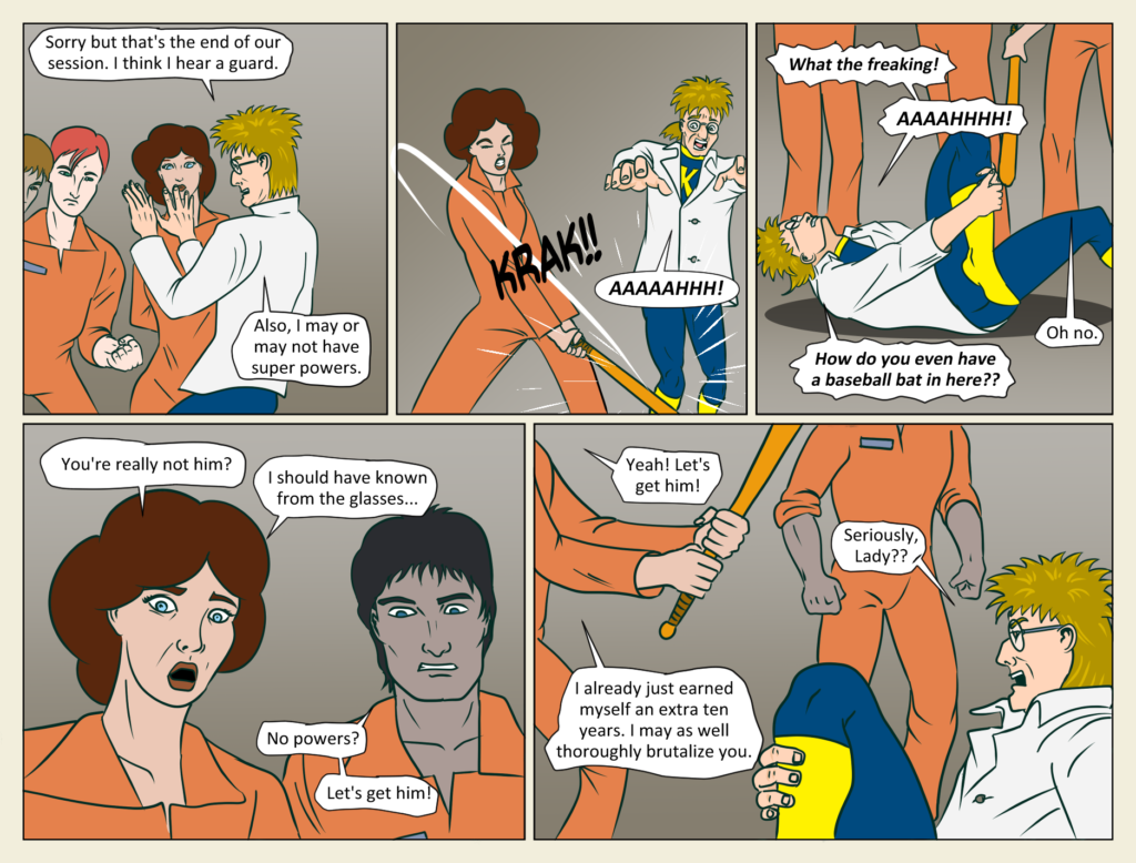 More questions! Is this Kickman but he somehow lost his super leg strength? Is it his long lost brother? An imposter? If so, then who is it? Where did that baseball bat come from? Find out in next week’s episode![…]↓ Read the rest of this entry…