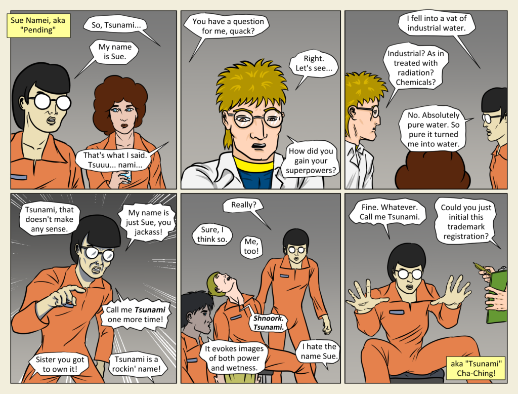 So for those of you that didn’t recognize Sue Namei, aka “Tsunami” from the Chapter “Dry Spell.” No Easter Egg points for you! (I bet Joyce spotted her). While getting Ms. Namei to take on the villainous super identity of[…]↓ Read the rest of this entry…