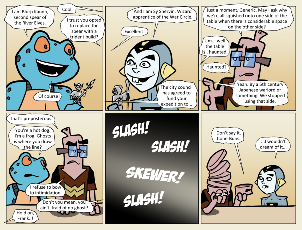 I had to come up with some reason to keep everyone in frame and facing the camera. Also, to show off Frank’s regeneration super power. 2 birds with one spectral samurai sword. Since this week Frank has the majority of[…]↓ Read the rest of this entry…
