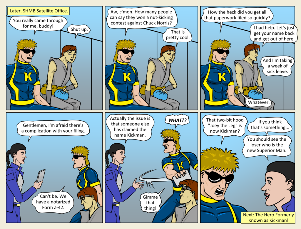 A new phase in the life of the Hero Formerly Known as Kickman. What does the future hold for Ampersand? Will Alpha Male ever reproduce? Will the new Superior Man hate the new Kickman? When will Chuck Norris re-appear?