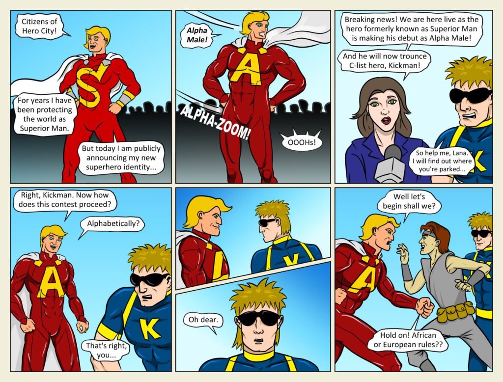 Obviously, European Rochambeau rules are far and away different compared to African Rochambeau rules. Can Generic Kung-Fu Superhero Sidekick pull a quick one and save Kickman from severe genital trauma? Find out in next week’s episode of Kickman!