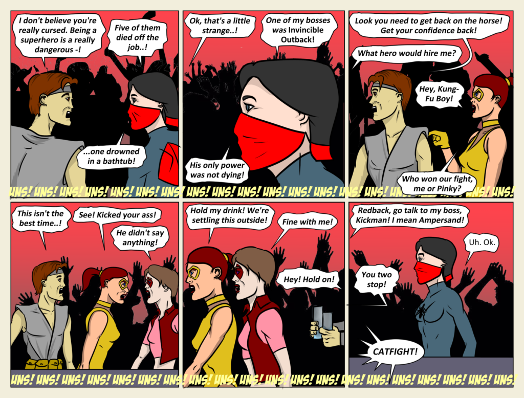 Intoxication Level: High Can Generic Kung-Fu Superhero Sidekick prevent the re-match that several fans (and many C-list superheroes that show up in the background from time to time) have been requesting? What will happen to Redback, the outcast sidekick without[…]↓ Read the rest of this entry…