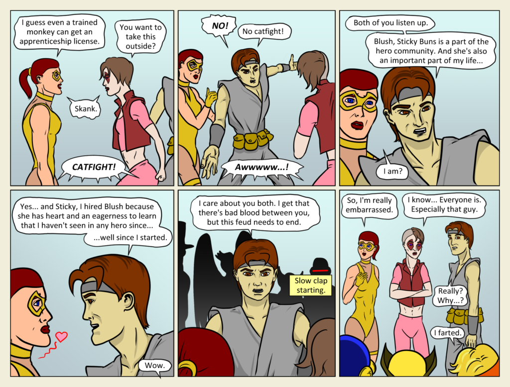 Will there finally be peace between Sticky Buns and Blush? Will Generic Kung-Fu Superhero Sidekick and Blush finally get together? Will Blush eventually become a great superheroine with her power to detect embarrassment? And most importantly, who farted?? Oh, never[…]↓ Read the rest of this entry…