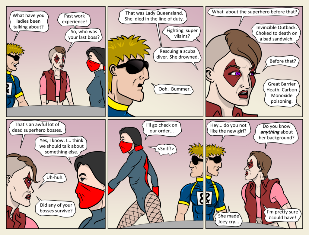 Intoxication Level: Pretty Darn High, although it looks like Blush is starting to sober up… Is it coincidence? Is Redback cursed? What will Blush do? Will Kickman kiss her? Find out in the next exciting episode of The Hero Formerly[…]↓ Read the rest of this entry…