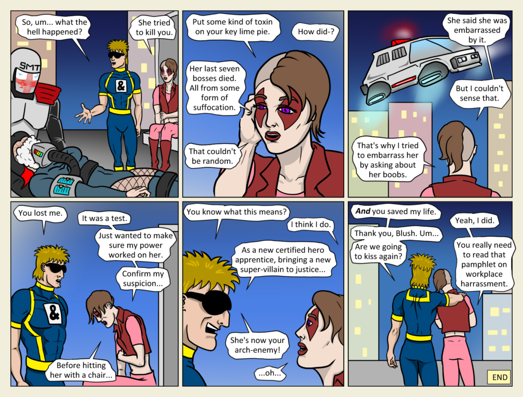 End of chapter! So it was titled Hero Mixer because: A “mixer” is a social event The superhero teams/partners got all mixed up There were a LOT of mixed drinks. See, it all makes sense in the end. Be honest,[…]↓ Read the rest of this entry…
