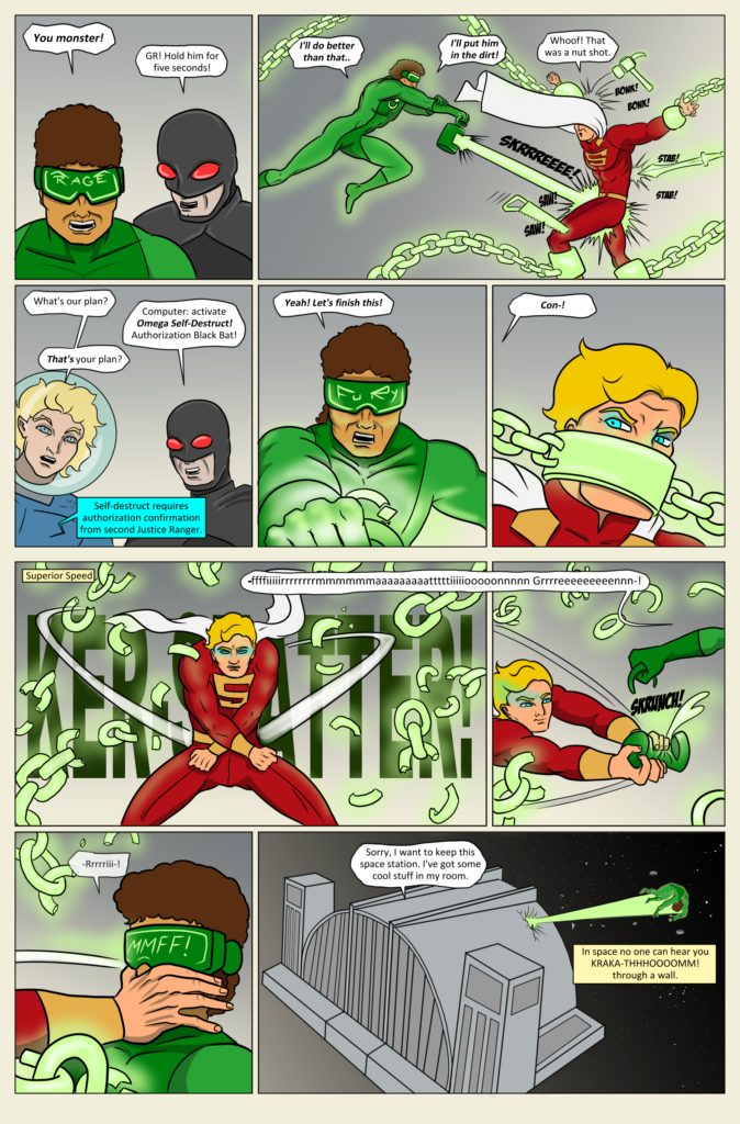 Two Justice Rangers down, two to go. Double page action spread this week. I really needed seven panels for this week’s action sequence. Instead of trying to cram it in too tightly, I just slowed down the superspeed to cinematic[…]↓ Read the rest of this entry…