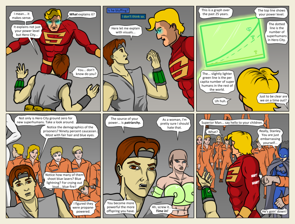 So, nobody guessed that Superior Man is powered by procreating. Now everybody has to go back to the beginning of this battle and see how many glowing-blue-eyed felons there are in the prison. Kudos to SVGeezer, who was on the[…]↓ Read the rest of this entry…