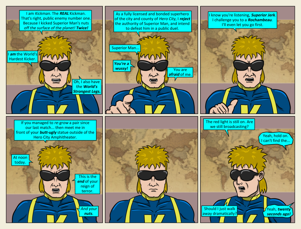 Dramatic timing is not his super power. Kickman opens up with a bold, possibly suicidal, move. For those wondering, Kickman’s super strength in his legs does not extend to other appendages below the waist. A kick from Superior Man will[…]↓ Read the rest of this entry…