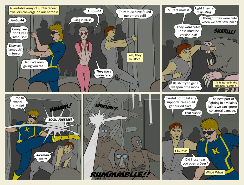 “Moles of Unusual Size? I don’t believe they exist.” Can Blush hold it together? Can Kickman restrain his kicking power enough to not kill everybody in the tunnels? Will PETA come after Kickman, LLC for whacking that mole? Find out[…]↓ Read the rest of this entry…