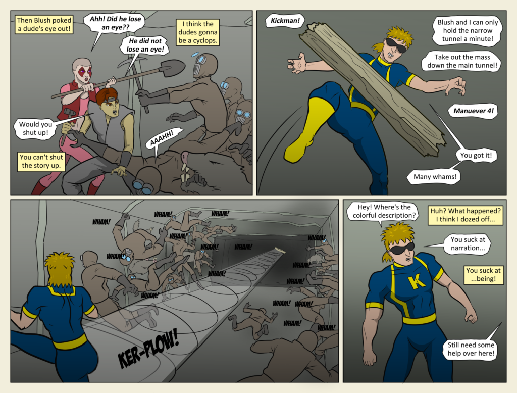 “With fluid grace Kickman flicks the timber into the air and sends it windmilling down the length of the tunnel. Cutting through minions and mole mutants like a scythe through grain.” See was that so hard?? The narrator is beginning[…]↓ Read the rest of this entry…