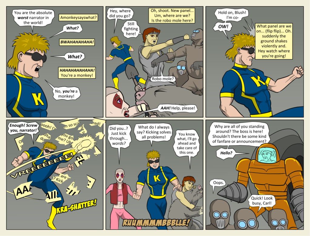 Count Mole has entered the field of battle! And no one noticed. How did this comic strip ever function without a narrator explaining everything for us? Find out next week in KICKMAN vs COUNT MOLE! Cue the theme music! (full[…]↓ Read the rest of this entry…