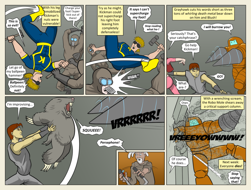 It’s not easy drawing an upside down Kickman. So, something extremely interesting has happened in this particular page. Something that most people probably would never notice, but I know that webcomic readers are a particularly bright and perceptive bunch, so[…]↓ Read the rest of this entry…