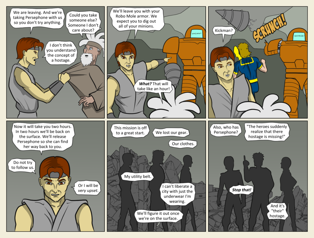 Now even Blush is breaking the fourth wall. She’ll have to be promoted to “Sidekick’s Sidekick” soon. Or is that a side-sidekick? One more page then on to the next chapter! I’m sure you’re all anxious to see Team Kick[…]↓ Read the rest of this entry…