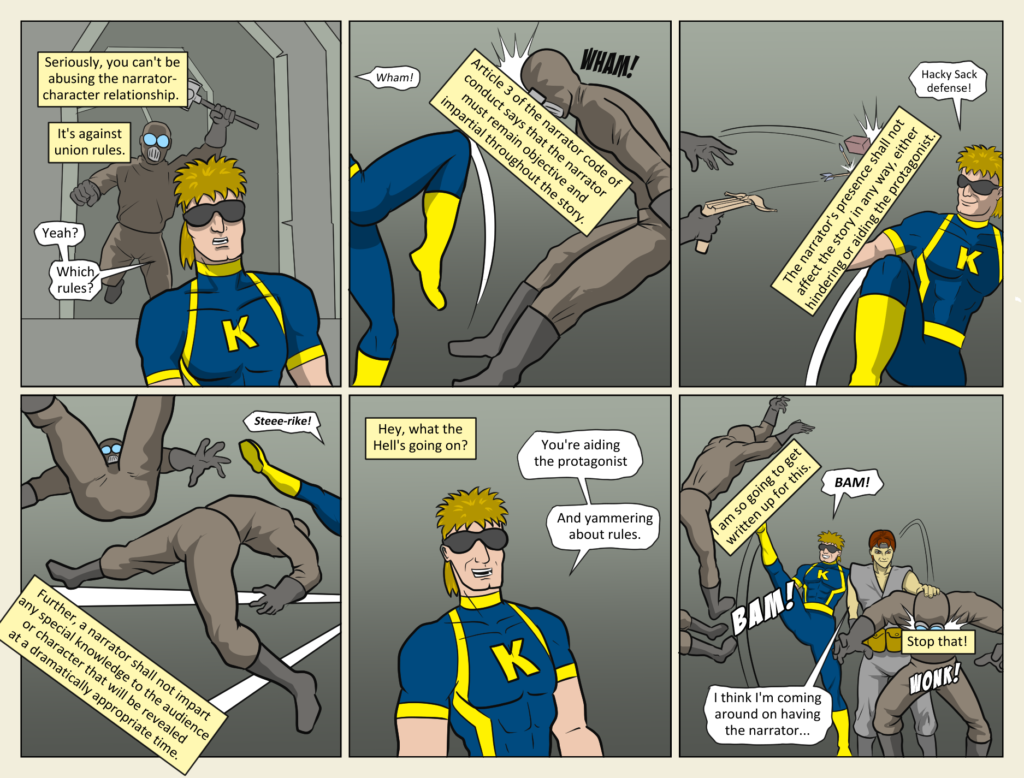 “Abusing the Narrator” So, now that they’ve gone full using and abusing the narrator, we have to ask ourselves, how strong are those text boxes? Grayhawk is slamming a goon’s head against one and it doesn’t budge. Ditto with supporting[…]↓ Read the rest of this entry…