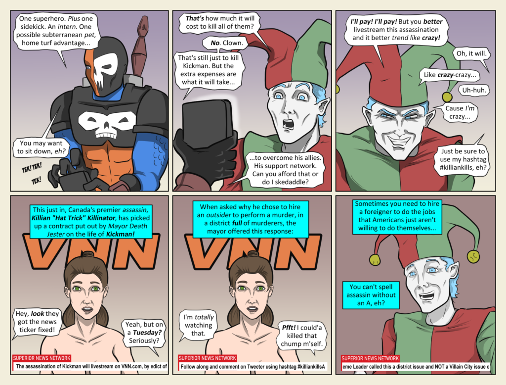 Meet the dread assassin, Killian “Hat Trick” Killinator! So, 10 Kick Points each to Sabrina Pandora for “Killinator” and to Simon Blacke for “Hat Trick.” I came up with Killian for his first name, but alas I get no Kick[…]↓ Read the rest of this entry…