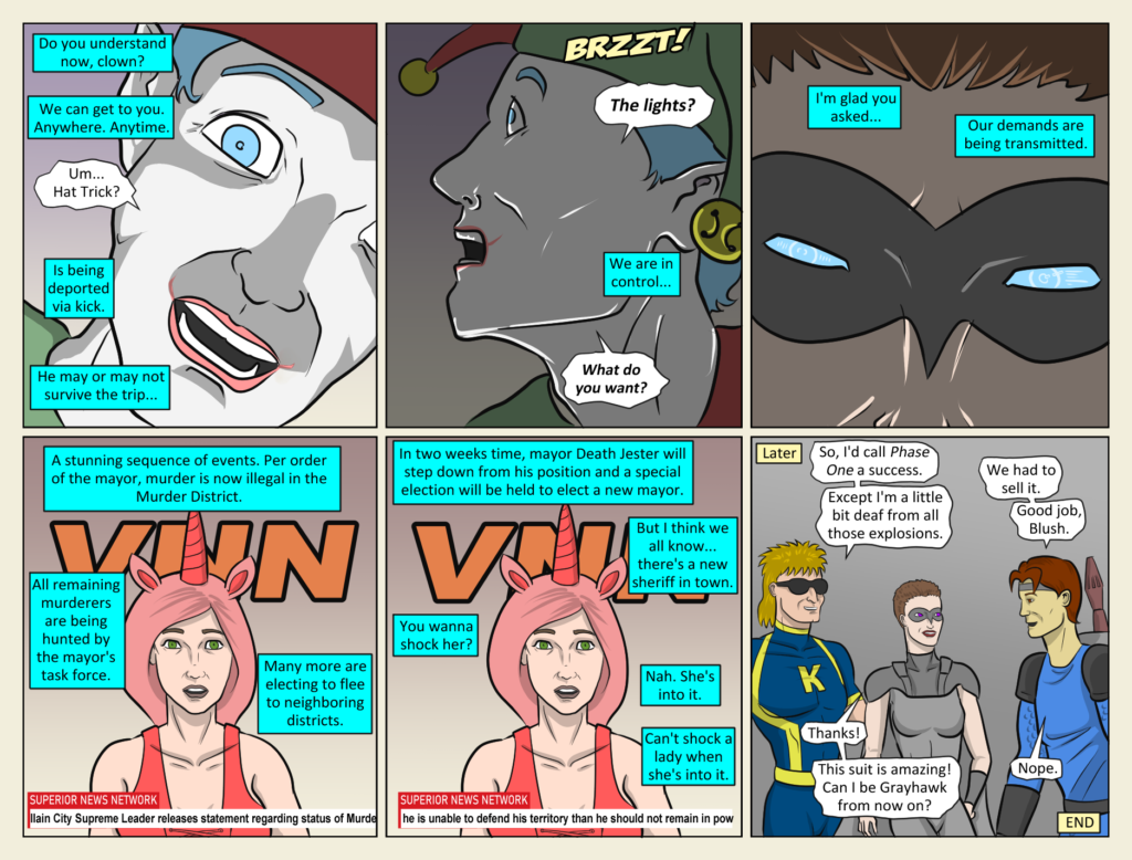 Successful Psyops campaign! Our heroes have managed to intimidate the clown into compliance. The Murder District is now free of villain control. Of course there were no villains with super powers in this district. Just the psychos that the Black[…]↓ Read the rest of this entry…