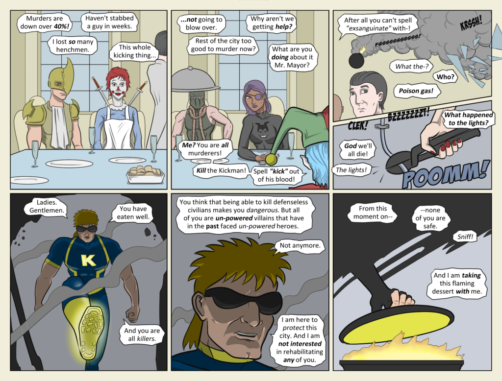 POOMM! There’s a new sheriff in town, criminals! With that dramatic lighting, their nerves surely will fray! Although technically, I guess Kickman is the criminal here, since murder is legal here in the Murder District of Villain City. In fact,[…]↓ Read the rest of this entry…