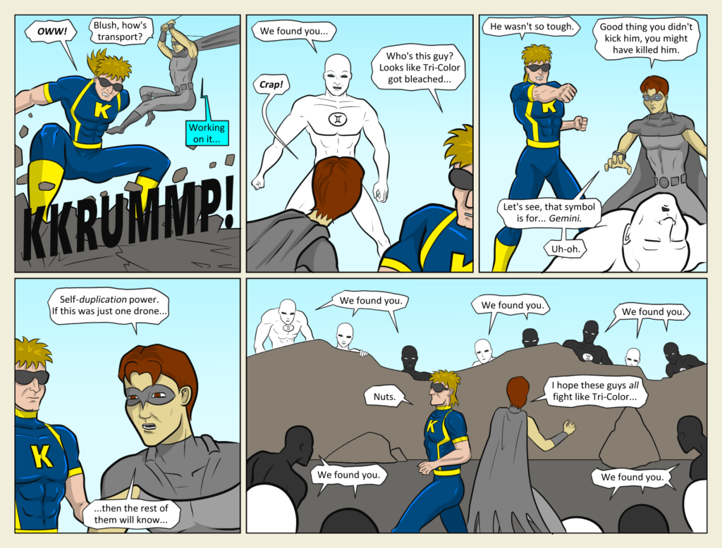 Poor Tri-Color gets no respect. In the old Marvel RPG using the FACERIP system, he would have more Feeble stats than Aunt May. Next: Kickman and Grayhawk Vs The Gemini Horde! On an aside note… the weather in Napa, California[…]↓ Read the rest of this entry…