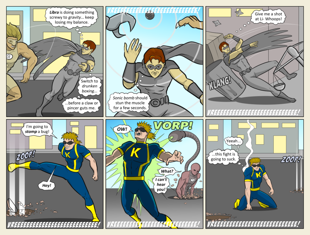 I realize I totally dropped the ball in that final frame. The shuriken that Matt flung off into the sky should have landed in Kickman’s shoulder. Preferably in the same spot where Matt previously hit him with a shuriken. Much[…]↓ Read the rest of this entry…
