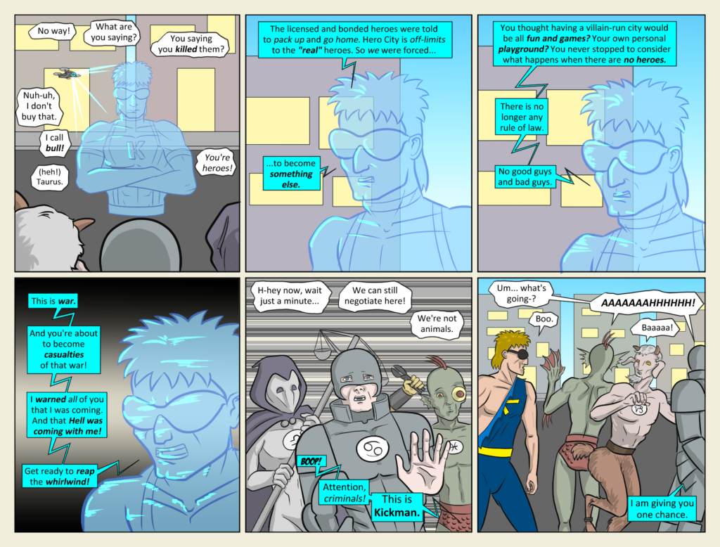 A tip of the hat to jd. for successfully guessing that this was a pre-recorded message. Also, for offering detailed reasons for his suspicion. Namely that Kickman’s costume is not destroyed and also because the message addresses not The Zodiac,[…]↓ Read the rest of this entry…