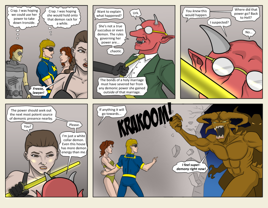 Uh-oh. Succubus lost her power and now all the tainted have powered up to ultra-super-filthy-tainted. Originally I was going to end this chapter after the wedding and some closing dialog and have Succubus gradually power down over the course of[…]↓ Read the rest of this entry…