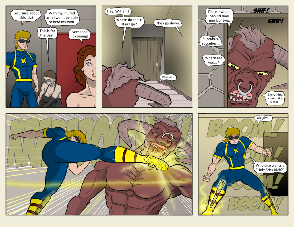 “Thou Shalt Kick!” That’s what those Hebrew letters say on the sacred staff in the last panel. Assuming Google Translate is in the right neighborhood that is. Back when the glowing letters first showed up page 13, I had Google[…]↓ Read the rest of this entry…