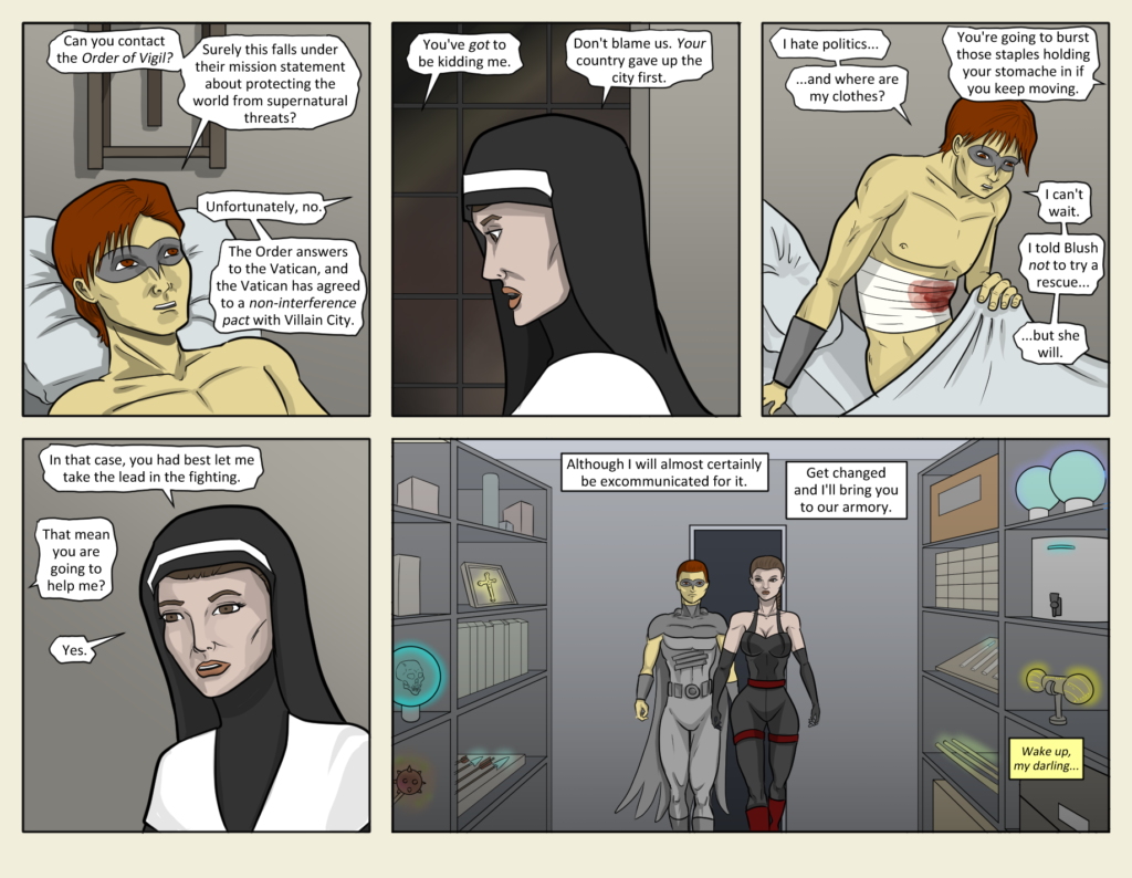 Enough recapping while languishing in bed! Elizabeth is out of her nun habit and back into her Princess Kitara/Lara Croft-hybrid outfit. Grayhawk is back in costume with some special Black Bat-strapping tape to seal up the claw wounds. Time to[…]↓ Read the rest of this entry…
