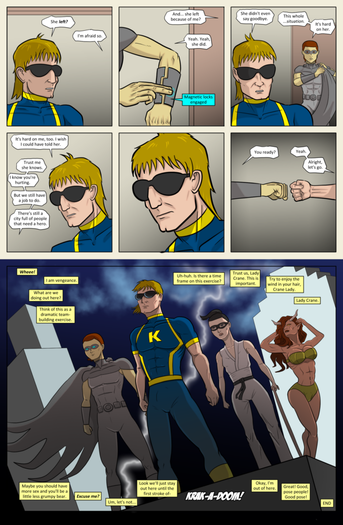 End of chapter! Sorry about the missed update last week. So this week, we get a double page. Well, one regular page and a poster with some dialog to distract you. When Blush first joined Team Kick, that chapter ended[…]↓ Read the rest of this entry…