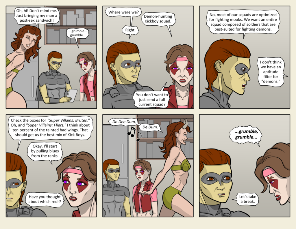 I know some of you were excited to have Angelina start gaining angel power instead of demon power from having sex now that she’s married. But, nope, she’s got horns now. And they’re getting bigger fast. Blush is not handling[…]↓ Read the rest of this entry…