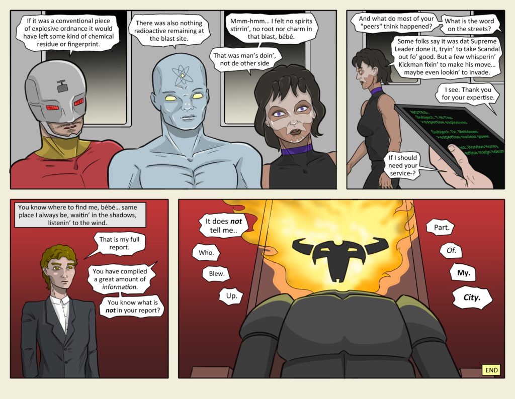 Plot twist! If Supreme Leader didn’t go scorched earth, then who did? If Scandal wasn’t the target, who was? Who’s going round blowing stuff up in Villain City? Answers will be revealed at some point in the future. Maybe. There’s[…]↓ Read the rest of this entry…