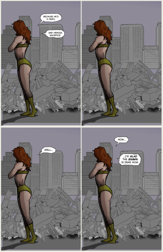 Retcon pages! I took my own and vadan’s advice and swapped out the final panel of page 30 for an extra, long, dramatic-pause introspective monologue page 31 just for Angelina to prove that she is both tender and evil. I[…]↓ Read the rest of this entry…
