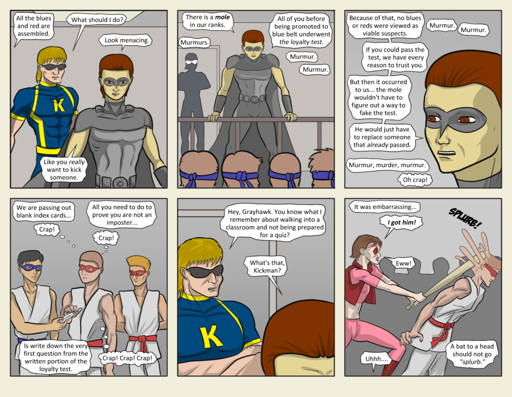 So, 5 Kick Points to Vadan, for guessing that “the traitor just took the place of the real mantis-” and also, 5 Kick Points to Archives for guessing “Shapeshifter!” Hey, looks like we’re about to have a super-battle or something…[…]↓ Read the rest of this entry…