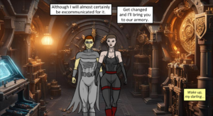 Enough recapping while languishing in bed! Elizabeth is out of her nun habit and back into her Princess Kitara/Lara Croft-hybrid outfit. Grayhawk is back in costume with some special Black Bat-strapping tape to seal up the claw wounds. Time to get up and do some hero-ing!